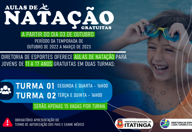 A diretoria de Esporte, Lazer, Turismo e Cultura disponibilizará aulas de natação gratuitas para jovens e adolescentes de 11 a 17 anos!